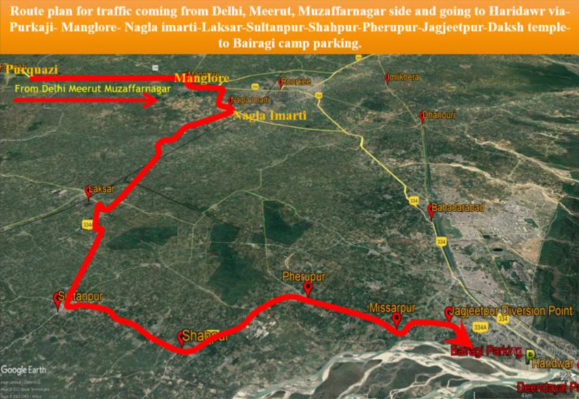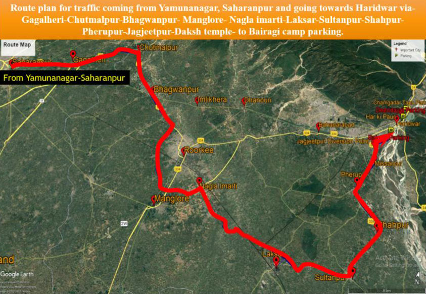 बढेडी मार्ग के बाधित होने पर कांवड वाहनों को सल्फर मोड से लक्सर/खानपुर होते हुए वाहनों की निकासी करायी जायेगी।