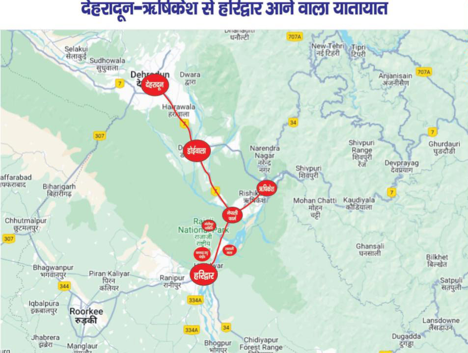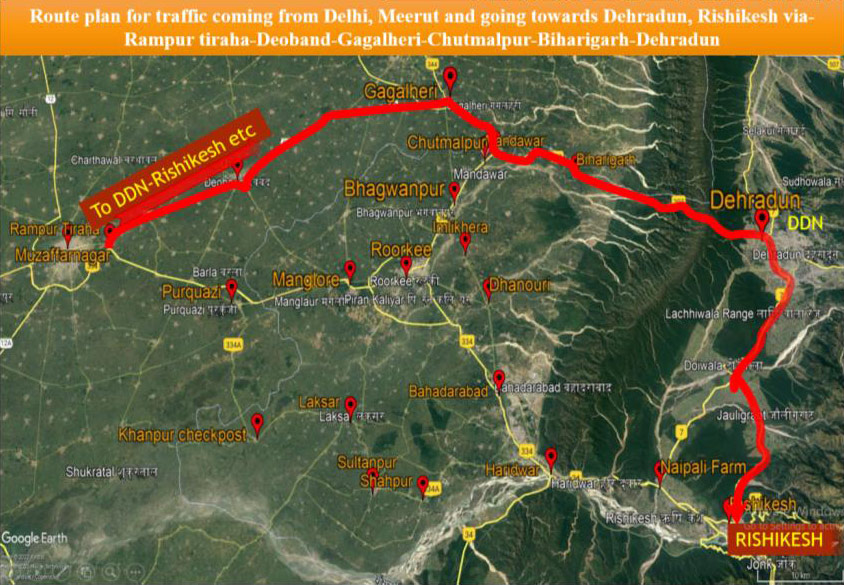 सप्त़ऋषि से बहादराबाद के बीच वाहनों का दबाव/जाम की स्थिति में (वाल्मिकी चौक, रानीपुर मोड, पुराना रानीपुर मोड से बीएचईएल होते हुए कुछ समय के लिए धनौरी मार्ग से निकासी करायी जायेगी)।